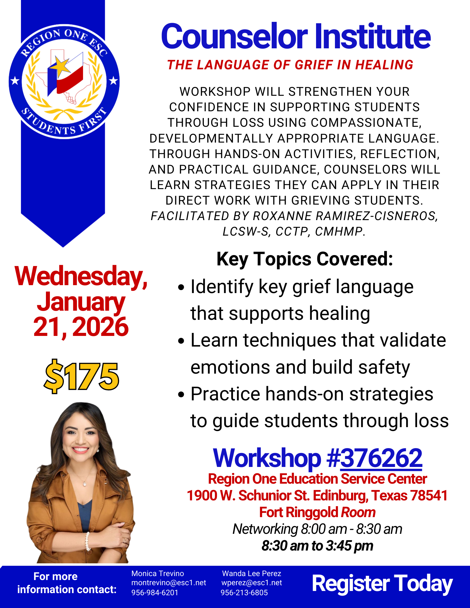 This workshop will strengthen your confidence in supporting students through loss using compassionate, developmentally appropriate language. Through hands-on activities, reflection, and practical guidance, counselors will learn strategies they can apply in their direct work with grieving students. facilitated by Roxanne Ramirez-Cisneros, LCSW-S, CCTP, CMHMP.